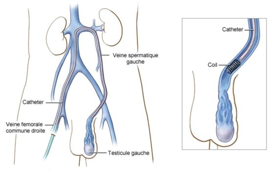 L’embolisation sert à arrêter ou fortement diminuer le retour veineux anormal dans la veine spermatique pathologique.