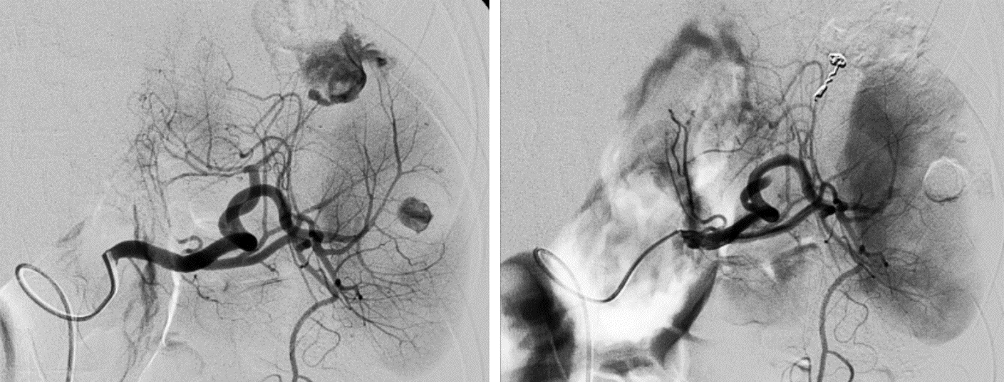 - Embolisation des artères rénales/splénique/hépatique : En cas d’hémorragie active avec risque vital souvent après une chirurgie ou un traumatisme de type accident de la voie publique.
