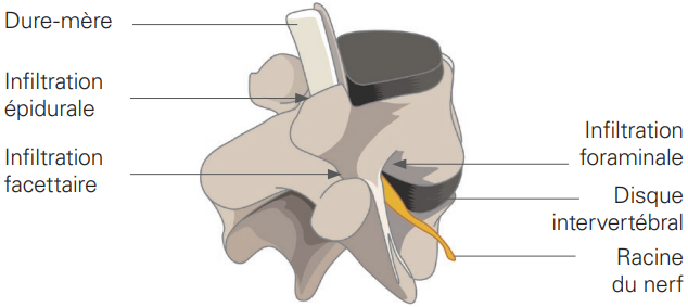 Pour ce qui est du rachis/colonne vertébrale, il existe deux types d’infiltration :